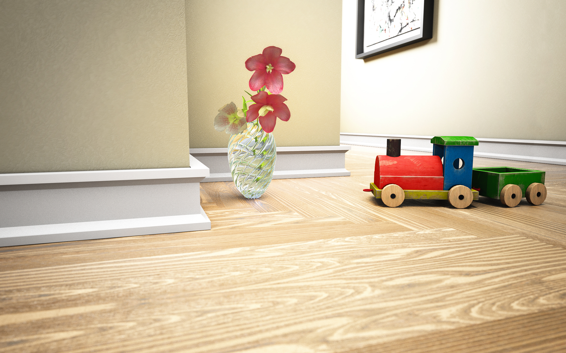 Develop interior visualizations for a custom baseboard manufacturer, focusing on material readability and spatial perception within controlled lighting conditions.