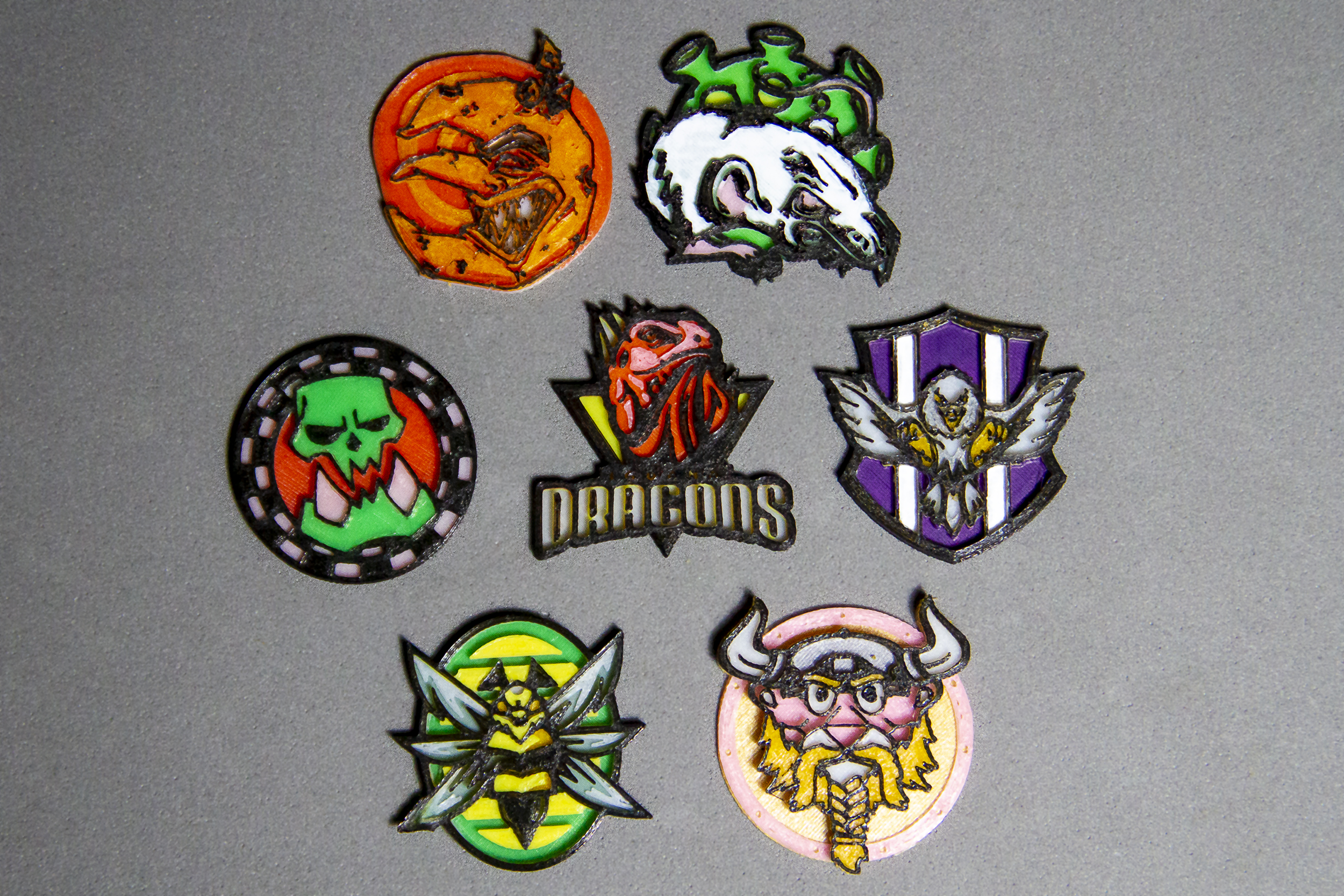 Each token uses relief-based geometry where icon elements are separated by height levels. Color transitions occur by changing filament at specific layer heights during the print process.