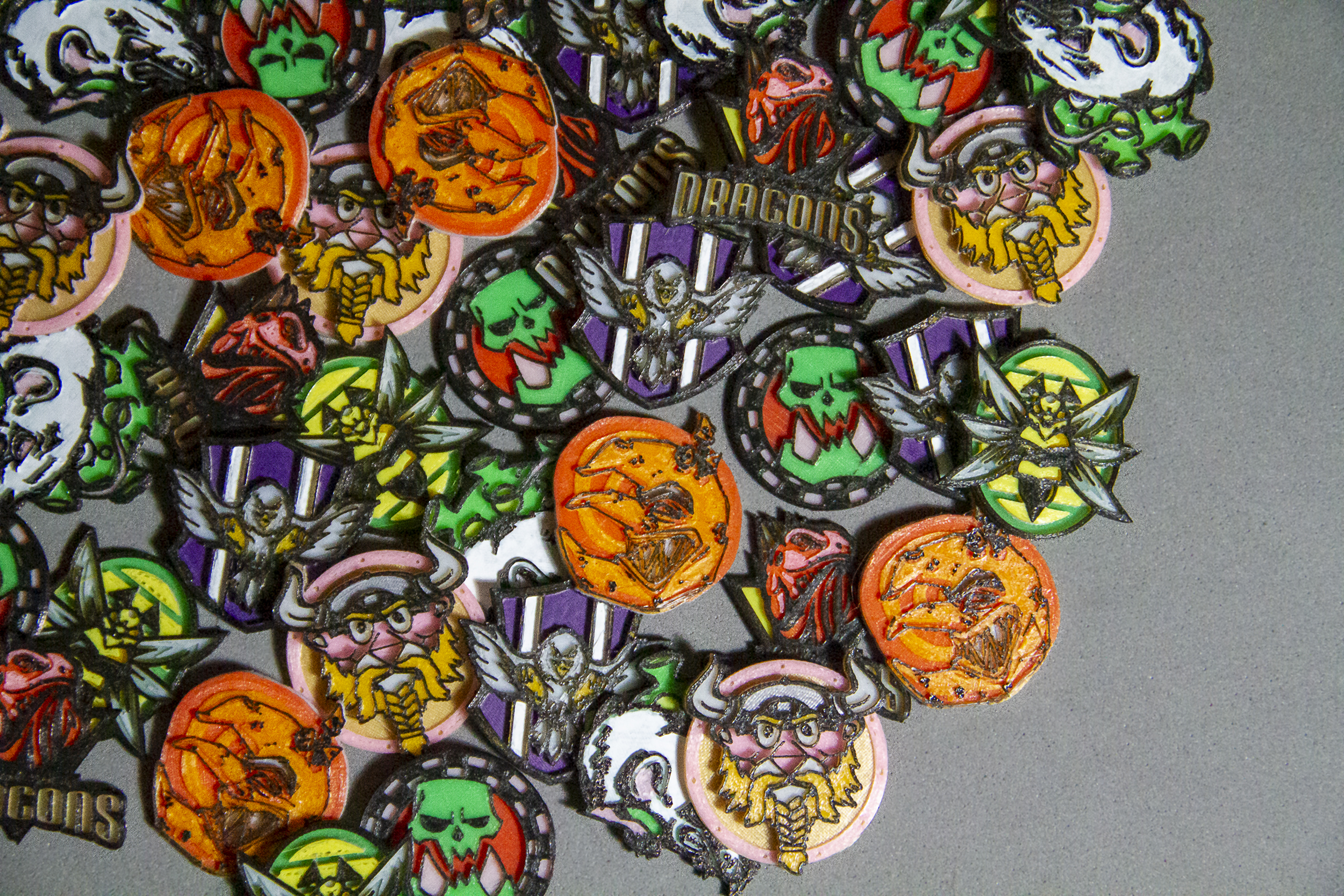 Tokens share a common structural base with a consistent diameter of approximately 32 mm. Individual designs vary in silhouette and graphic composition while maintaining the same layered logic.