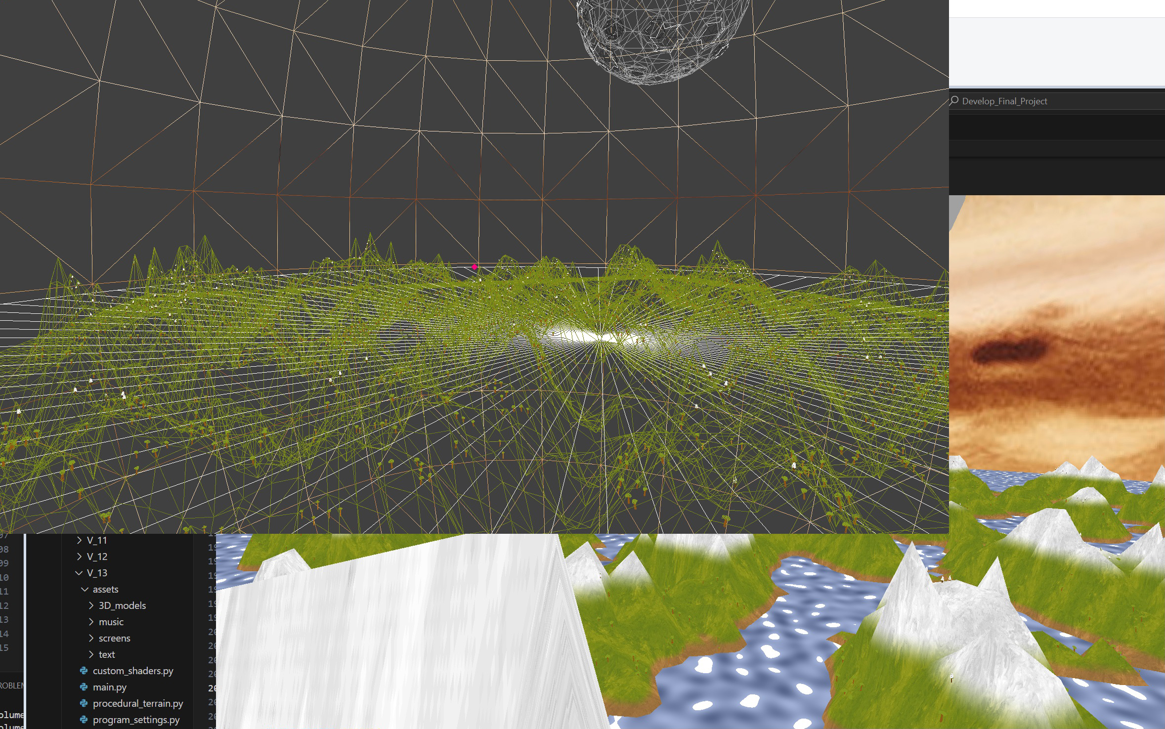Develop an interactive terrain exploration environment generated procedurally through noise-based algorithms and custom shader systems for planetary surface visualization.